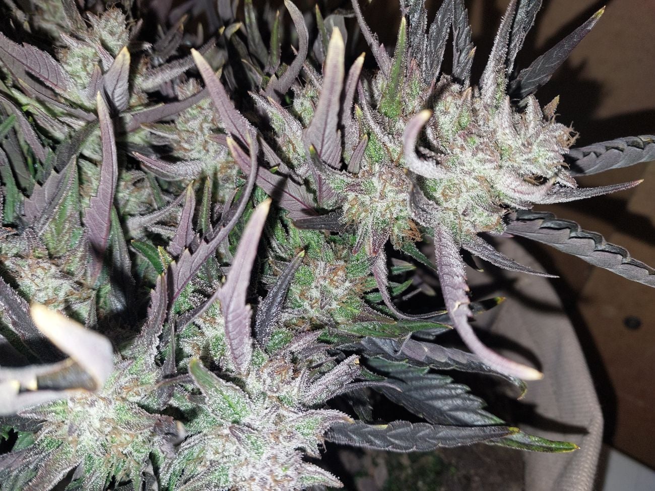 Due to the Indica heritage, this plant has short internodal spacing which gives the impression that each individual branch is growing one massive bud. The beautiful dark lilac flowers contrast perfectly with the wide fan leaves that fade into a beautiful light green hue by the end of flowering.