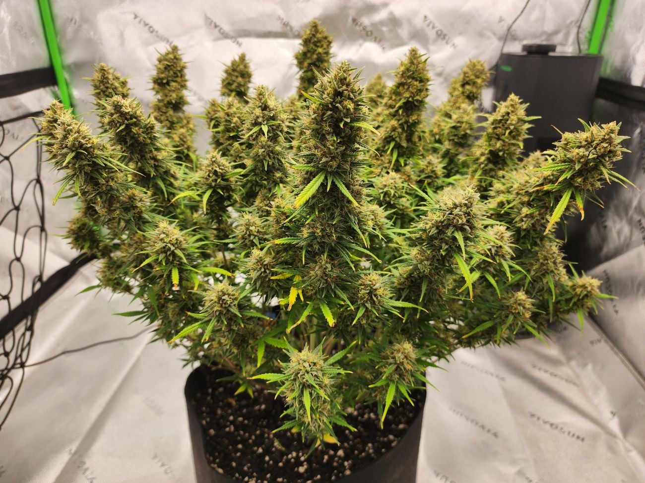This lady grows stout and bushy, reaching around 150cm while displaying a compact yet robust appearance with wide internodal spacing. She will develop a thick main cola with fat side branches all around while not requiring much maintenance. She can produce up to 650 gr/m2 in around 10 weeks, putting her among the highest-yielding strains we’ve ever created. All throughout the flowering stage, you’ll be amazed at the insane trichome production. Especially in the final weeks when she definitely packs on some weight and you see the buds getting white in resin and reeking of cookies and gas.