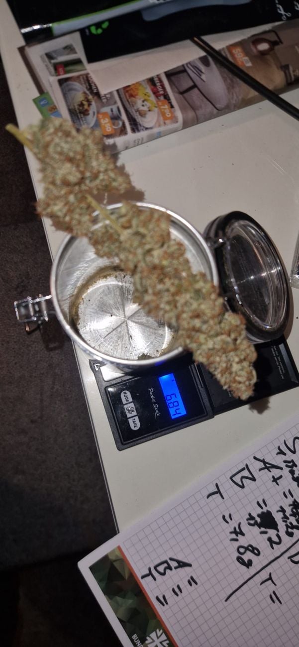 6 Monate davon 5 vollständig draußen. Einfach, robust, zu grown. 27 Liter Stofftopf der am Ende ein einziger kompakter Wurzelballen war. Mein erste Grow Outdoor. Dünger regelmäßig organisch aber nicht allzu viel. Was für eine schöne Pflanze, Blüten riesig, kompakt, tolles lila, stinkt ordentlich und klebt gut. Kaum Problem mit Faule etc. Aber immer schön luftig halten, wenn die Blüten kommen. Nach 4 Wochen Blüte moderat ausgedünnt. Ergebnis top genau 2 Meter aus dem Topf (siehe Zollstock Bild 8). Dicke Buds. Tolle Ernte. Schaut euch die Bilder an (Juni bis Oktober)