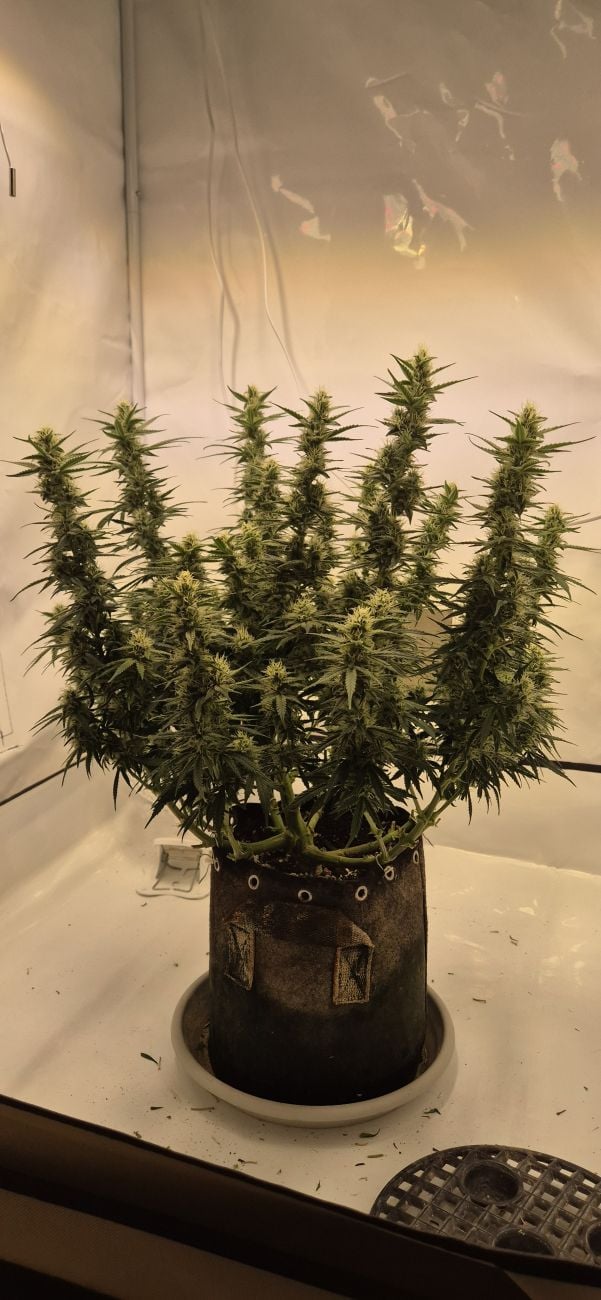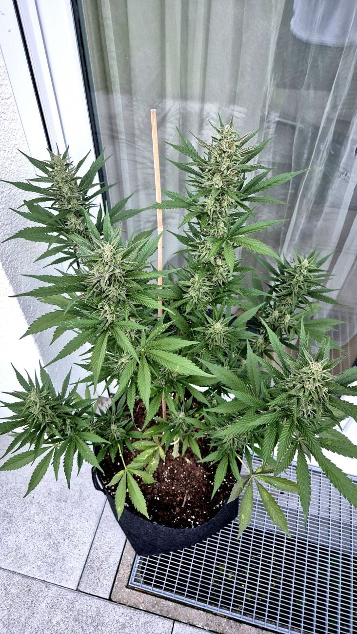 Was soll man sagen. Ich versuche mich mal kurz zu halten. Von Anfang an starker Wuchs. Sonnenverwöhnt. Kann nicht genug kriegen. In der ersten Blütewoche zwei untere Fächerblätter entfernt. Da ging die Grand Dame für zwei Wochen in den Urlaub. Danach weiterhin starker Wuchs, wobei sie schätzungsweise bei eleganten 1,10 bis 1,20 m mit Topf geblieben ist. Die Nebenzweige bildeten sich ebenfalls prächtig und entwickelten herausragende Buds, überzogen von Trichomen in einer milchig trüben Qualität. Zum Schluss und beim Ausspülen scheinte das Prachtstück mit violetten Tönen und ca 5 % bernsteinfarbenen Trichome. Insgesamt waren es ca 12 Wochen bei einem doch recht üppigen Ertrag. Die Wirkung ist definitiv indicalastig. Von extrem chillen bis hin zum Schlaf der Gerechten über die volle Distanz. Ich kann nur ein Lob und eine klare Empfehlung aussprechen.