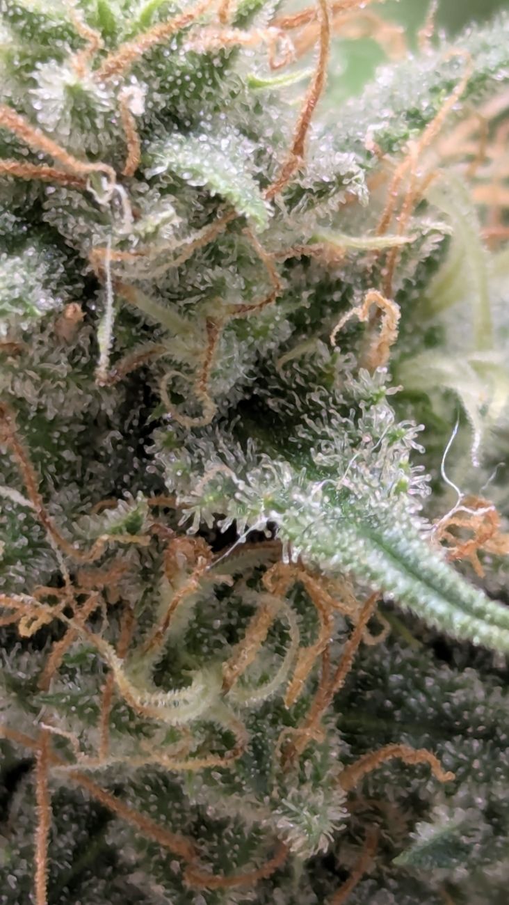 Die Kelche wölben sich aus, was zu spitzen, wuchtigen und langen Buds führt, über denen die Trichome glänzen. Aus der Nähe betrachtet sind die Buds eine Mischung aus Grün und Violett mit dicken, orangefarbenen Härchen. Extrem süßer Geruch, bei dem das Wasser im Mund zusammenlaufen kann.