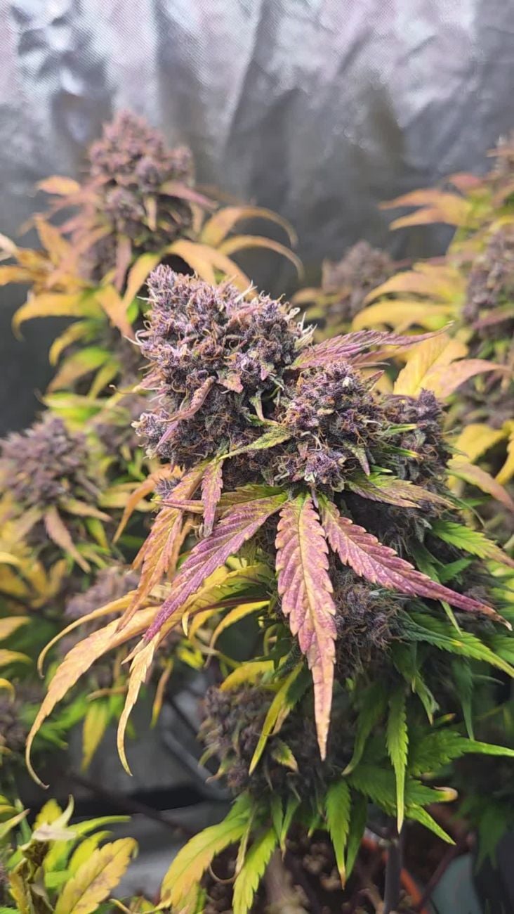 Jeg har lige høstet en Frostbanger, og jeg ved ikke helt, hvad jeg skal synes… Den er MEGET lilla, mere intens lilla inde i topskuddene end udenpå. Det er en lav, busket plante med masser af blade og næsten uhåndterligt mange topskud. Jeg var nødt til at beskære en del bare for at holde den ordentlig inde i teltet. Er der en chance for, at jeg har fået en Purple Haze i en Frostbanger-pose? Jeg har set flere af disse phenos på folks billeder. Er det muligt, at nogen har forvekslet nogle Purple Haze- og Frostbanger-frø på “fabrikken”? Min plante ligner rigtig meget den Purple Haze, der blev udgivet samtidig med Frostbanger.