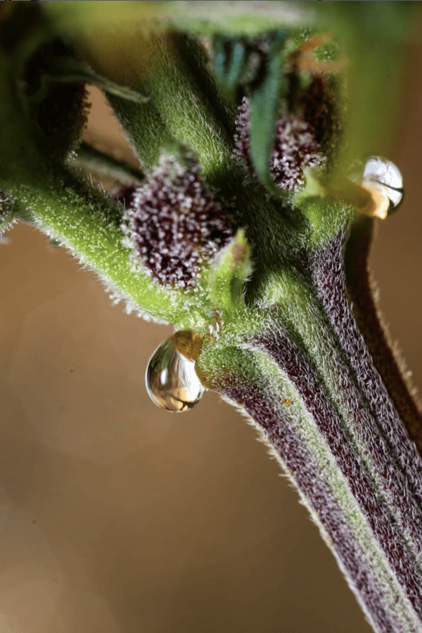 Compacta y explotando con color. Los cogollos C4 están formados por hojas moradas con pistilos naranjas cubiertos de cristales.