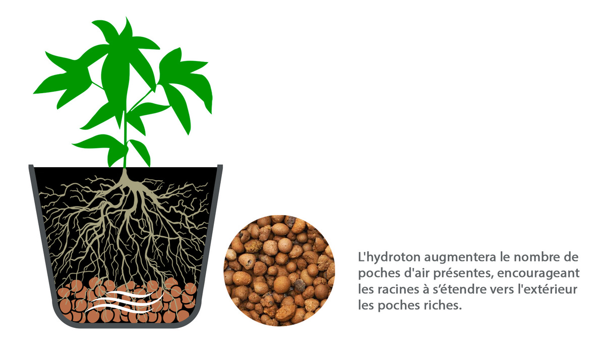 Associé à du coco dans une proportion de 50/50 ou utilisé pour tapisser le fond de vos pots, l' hydroton augmentera le nombre de poches d'air présentes, encourageant les racines à s'étendre vers l'extérieur à la recherche de nouvelles poches riches en oxygène.