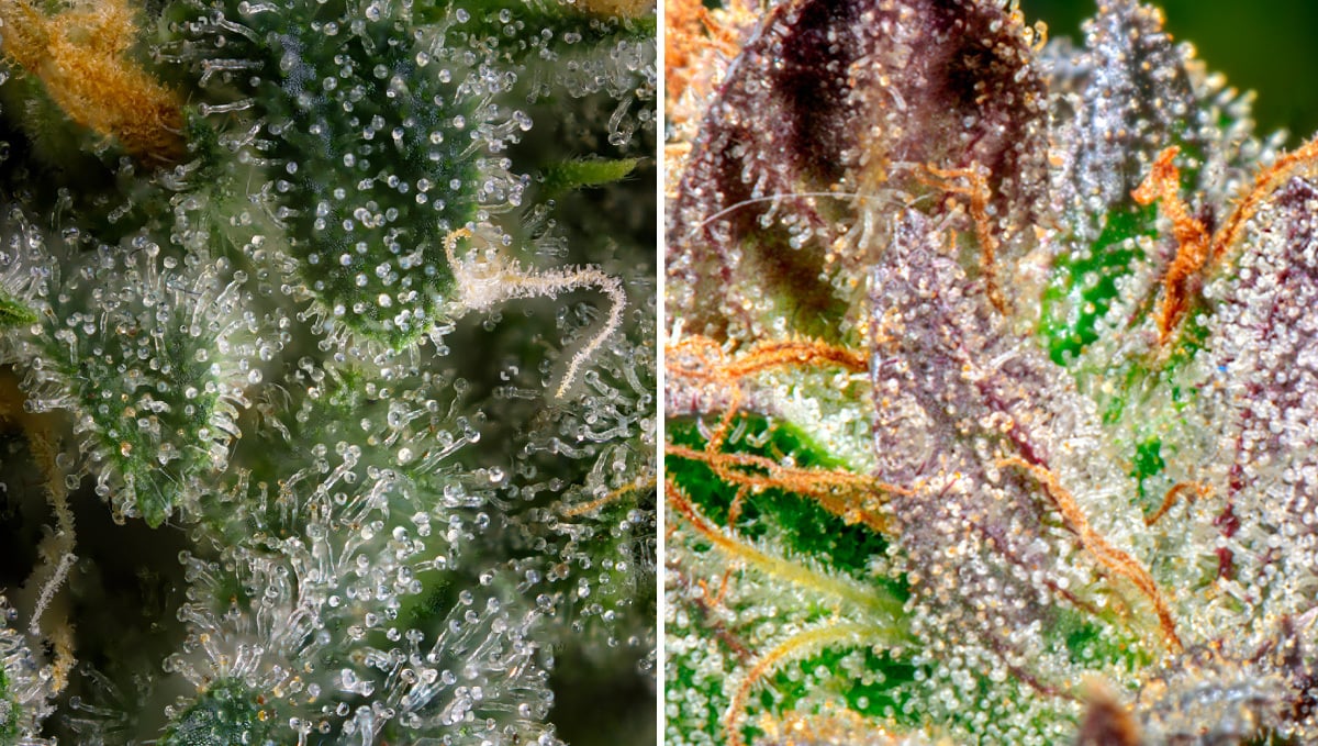 Les trichomes sont la partie anatomique la plus importante de la plante de cannabis, ce sont de petites glandes en forme de champignon (ou souches) qui produisent des cannabinoïdes et des terpènes (conférant des saveurs agrumes). Pour pouvoir les voir, vous aurez besoin d'une loupe, d'un microscope ou d'un très bon appareil photo. Ils ont différents états de dégradation qui peuvent être identifiés par leur couleur lors de la phase de floraison (clair, trouble et ambré).