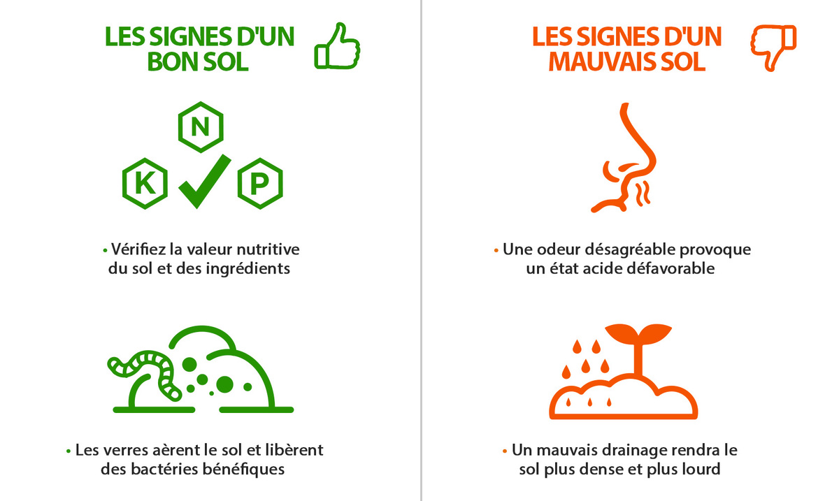 - Un mauvais sol aura une odeur désagréable qui est un signal d'alarme : les mauvaises bactéries sont présentes, ce qui fait que le milieu est dans un état acide défavorable.