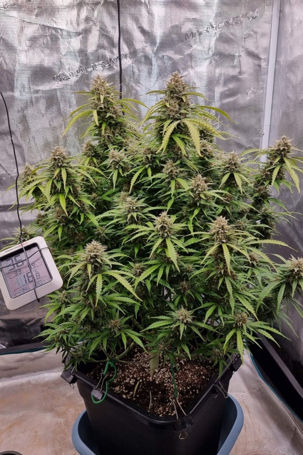 Cette variété pousse vigoureusement et montre clairement son héritage mixte. Le cola principal devient grand, atteignant jusqu\'à 150 cm, suivi de plusieurs branches latérales qui restent courtes par rapport au cola principal, mais qui poussent quand même assez longtemps et développent plusieurs sites de floraison qui se couvrent complètement de bourgeons gras de haut en bas. Cette variété reste compacte et, malgré sa hauteur, conservera cette structure typique de l\'Indica jusqu\'à la récolte, où elle finira par ressembler à une belle Indica atypiquement énorme.