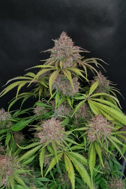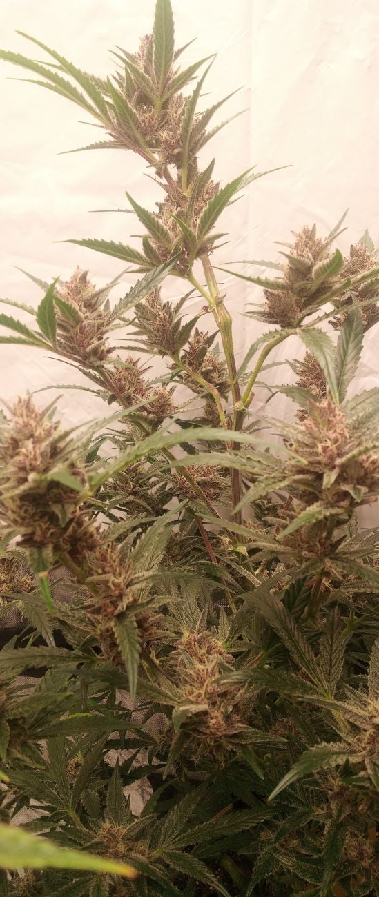 This strain is fast growing and is on the larger side. Does well with LST training. Has great branch structure that can hold the weight of it huge heavy purple buds. It has great spacing in between the buds that ensure you get dense frosty buds. Enjoys good feed and can get great results even in not so idea growing conditions. Perfect for beginners and great strain for medical patients. The plant in the photo was grown in five gallon pot using home made soil and using Cronk Auto Flower nutrients. Using Mars Hydro FC - E3000 grow light on a 20/4 lighting schedule. Fast Bud you guys keep up the great work providing the best genetics and flavors