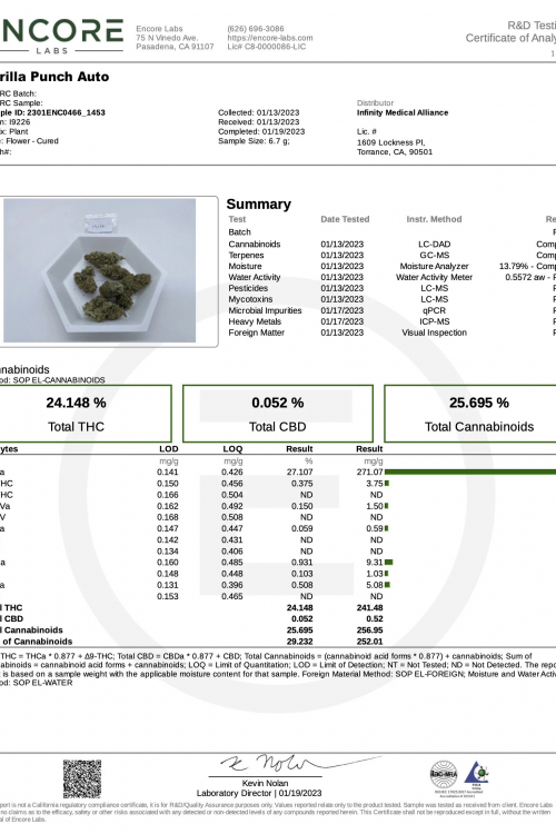• Potenza da knockout. Test di laboratorio: 25,695% di cannabinoidi.
