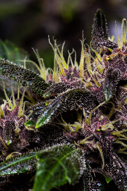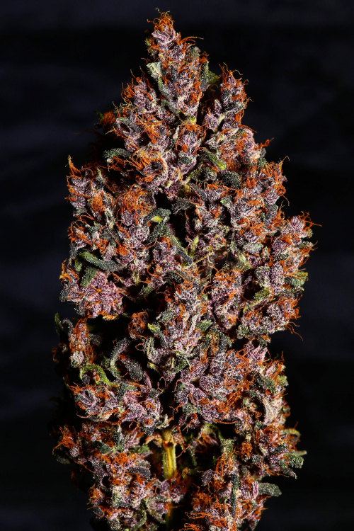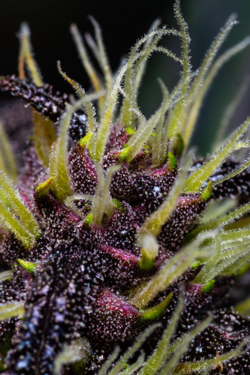 Темно-пурпурные шишки, покрытые сверкающими кристаллами и ярко-оранжевыми пестиками, делают этот сорт действительно уникальным.