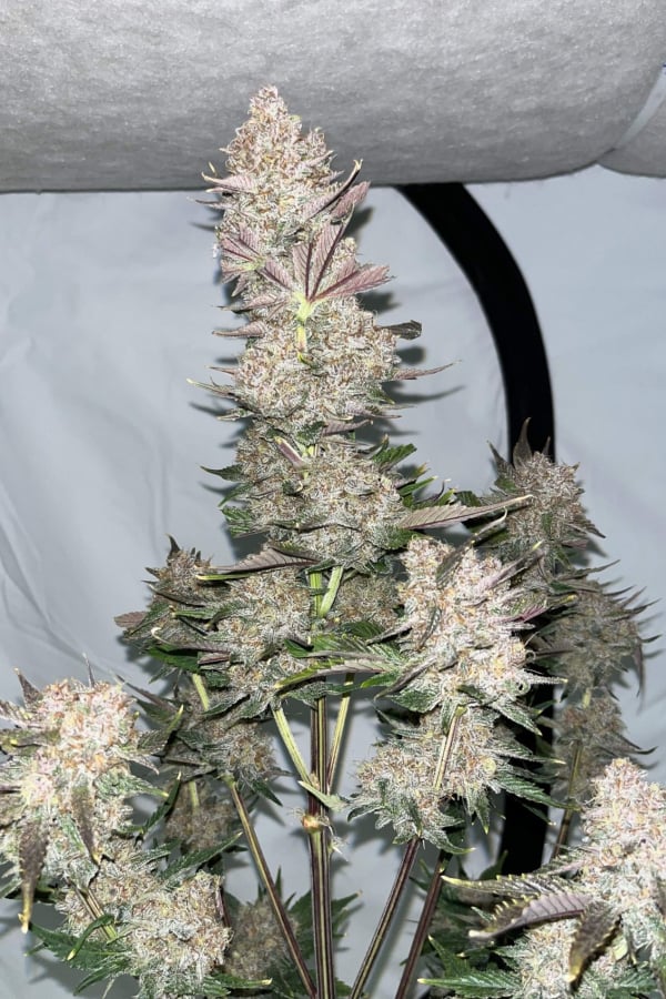 She grows compact and sturdy, topping out at 120 cm, with short internodes and heavy side branches stacked with dense, frosty purple-toned buds. Her appearance alone is stunning: neon green leaves contrast against pink, purple, and orange hues, all coated in a thick layer of trichomes that shimmer like powdered sugar.