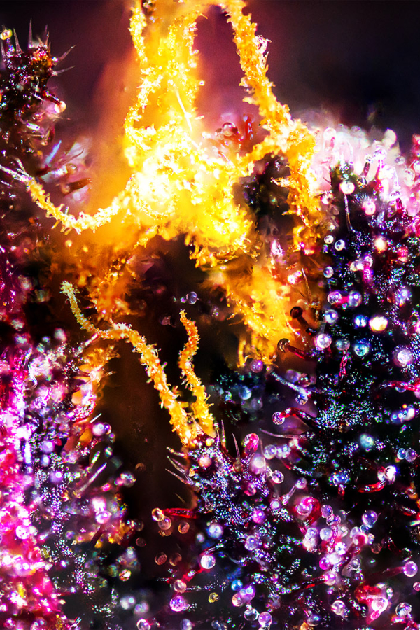 Explosively compact and erupting in color. C4 buds are made up of rich purple leaves with wispy crystal-covered orange pistils.